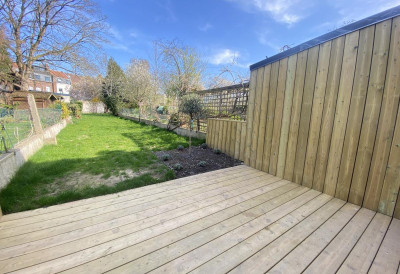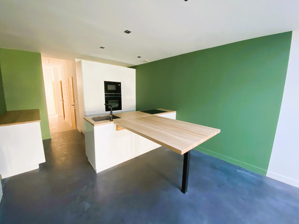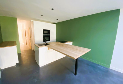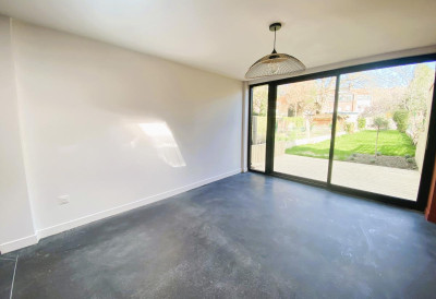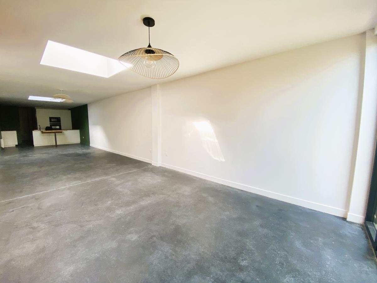 Au rez de chaussée vous trouverez côté rue un bureau et toutes les pièces techniques (buanderie, local vélo...) puis orientée côté jardin, une belle et spacieuse pièce de vie de 52 m² avec cuisine équipée ouverte, sol béton ciré et baie vitrée s'ouvrant sur un jardin d'environ 150 m².