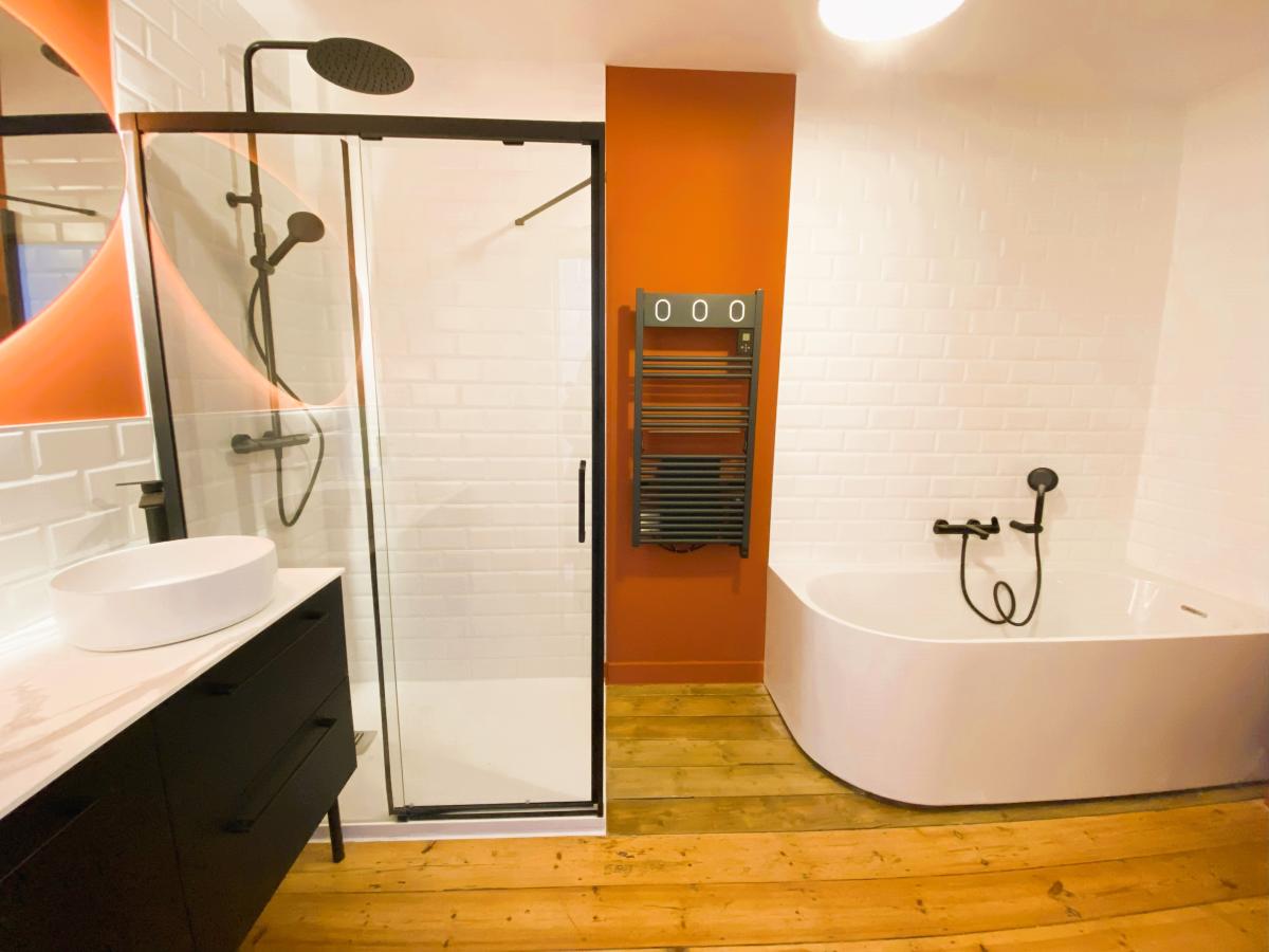 Au 1er étage, une belle chambre lumineuse de 15 m² et une salle de bains équipée à la fois d'une douche et d'une baignoire.