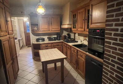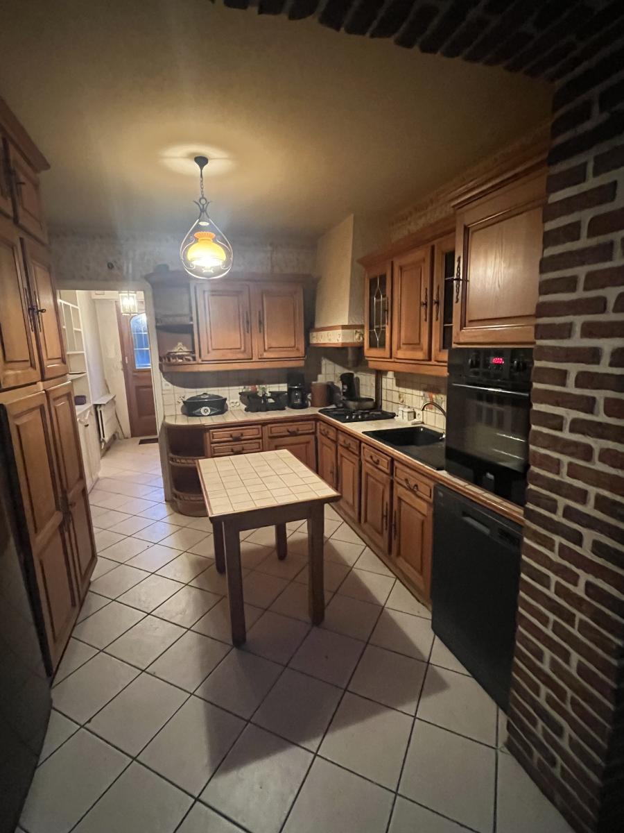 Salon avec cheminée feu de bois (insert) de 30m2, cuisine équipée et espace repas dans le prolongement 17m2 baie sur jardin clos sud-ouest