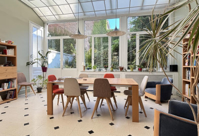 Au rez de chaussée un vaste hall d'entrée distribue un bureau, une double réception au cachet préservé, une salle à manger sous verrière, une cuisine équipée.