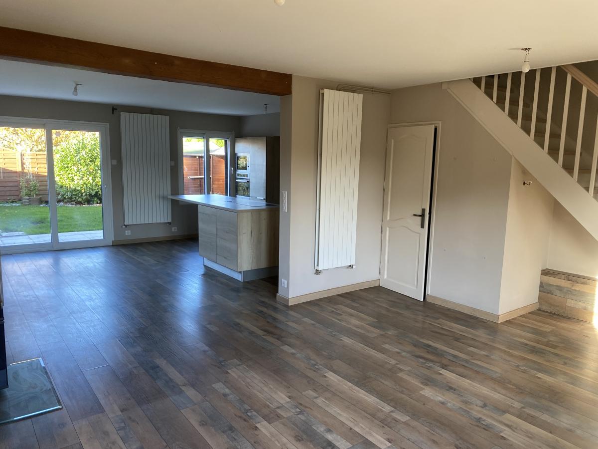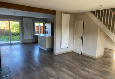 Provin, rue du Président Allendé, maison de lotissement; entrée, grande pièce de vie ouverte sur cuisine équipée, terrasse, jardin; à l'étage, 3 chambres, salle de bains avec vasque, baignoire, douche et wc. Chauffage gaz et poêle à bois. Loyer:950€, dépôt de garantie:950€, frais et état des lieux huissier:845€. Imperatif:3000€ CDI. Dispo. Contact:03.20.62.06.43.